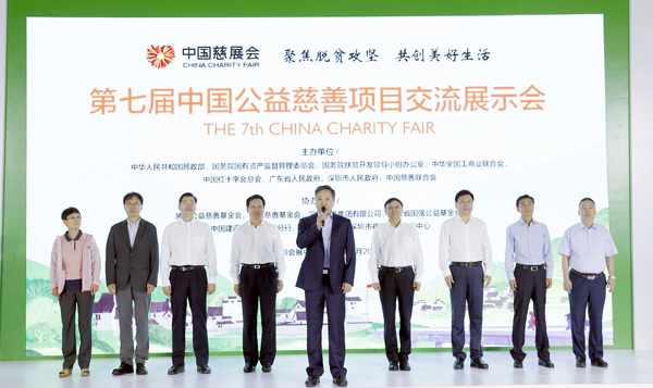 民政部副部長王愛文宣布第七屆中國慈展會開幕,廣東省委副書記、深圳市委書記王偉中(右四)、全國工商聯副主席謝經榮(左四)、深圳市市長陳如桂(右三)、國務院扶貧辦副主任洪天雲(左三)國務院國資委副秘書長庄樹新(右二)、中國紅十字會副會長孫碩鵬(左二)、廣東省民政廳廳長卓志強(右一)、中國慈善聯合會副會長兼秘書長劉福清(左一)等出席啟動儀式