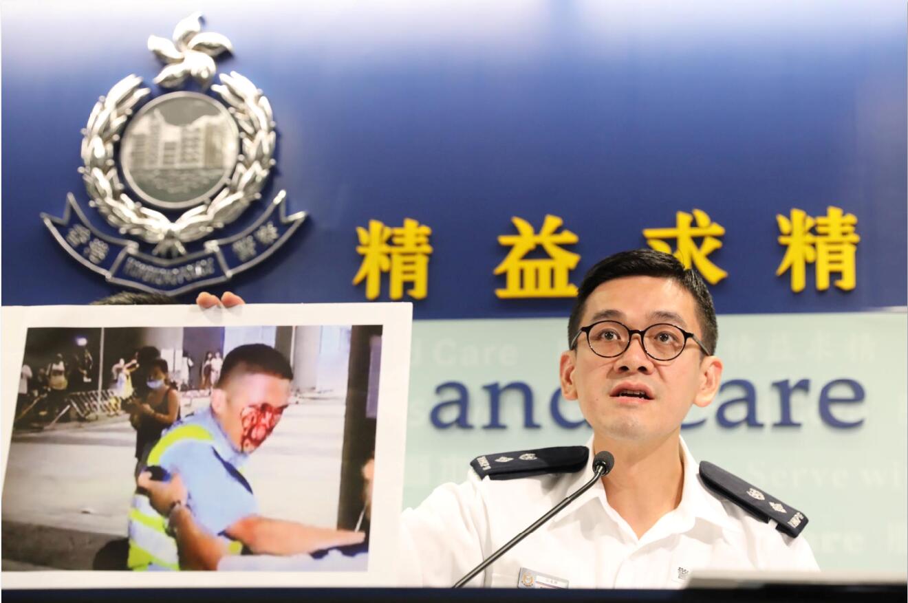 反修例示威過去100日共有250名警員受傷。警察公共關係科高級警司江永祥昨展示被彈珠擊中面部嚴重受 傷的警員圖片。 中通社