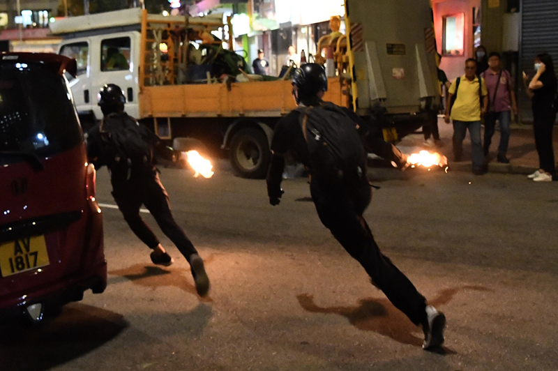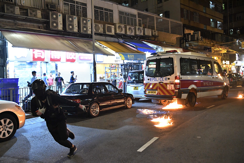 昨晚,大批示威者轉到元朗集結,部分激進示威者向警車及警員投擲汽油彈,一架警車被擊中着火。警員其後施放催淚彈驅散。 中新社