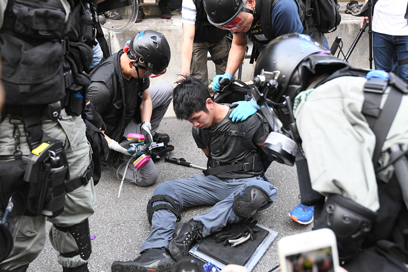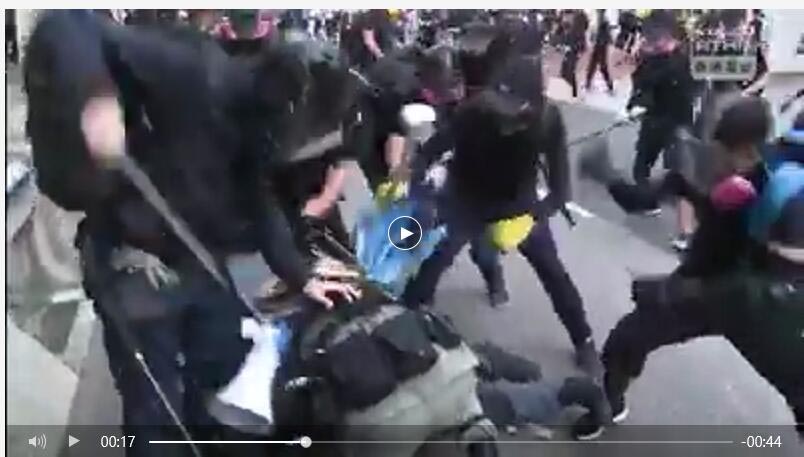 據理大學生報編委會昨晚在其Facebook上載一段長約1分鐘片段,拍攝到防暴警察追捕示威者情況;其中一名防暴警撲倒一名暴徒後,其他暴徒嘗試營救,一度圍毆該名防暴警員。期間有人試圖搶走其警槍,惟其他防暴警員從後趕至救人。一眾暴徒敗走。被撲倒的暴徒在其他警員協助下終於被制服。