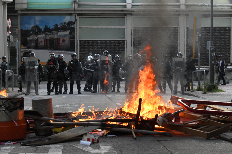5時後,一眾暴徒行動愈演愈烈,有暴徒從天橋向警方列陣投擲汽油彈,現場出現火光,場面危險;有暴徒更在屯利街一帶的馬路,以垃圾筒、鐵欄等築路障並縱火,現場火光熊熊,黑煙更升到數層樓高。