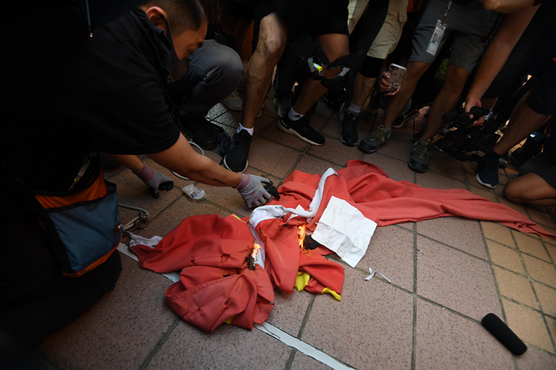 有蒙面暴徒在遊行終點屯門政府合署將懸掛的國旗扯下,並用火焚燒。 記者 崔俊良攝