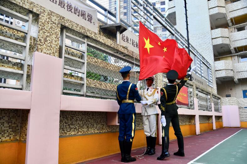 上午8時許,學生於操場集合,整齊站立。解放軍駐香港部隊儀仗隊官兵踏著正步攜國旗入場,全體師生行注目禮。隨伴奏聲起,全場同唱國歌,注視國旗緩緩升起。隨後,校方向儀仗隊官兵致送紀念品。