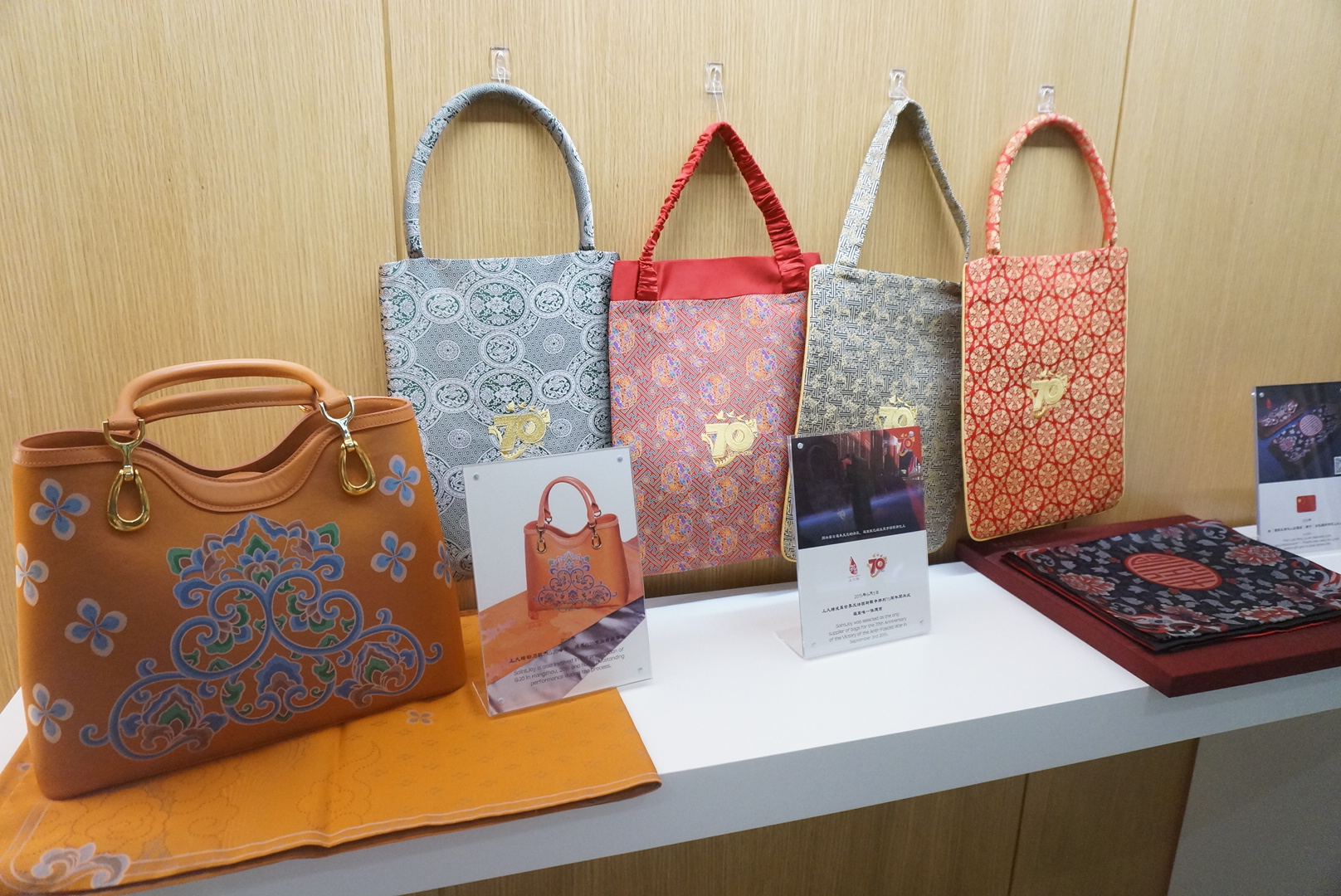 現場展出多款以宋錦設計的精美手袋。(洪嘉禧攝)