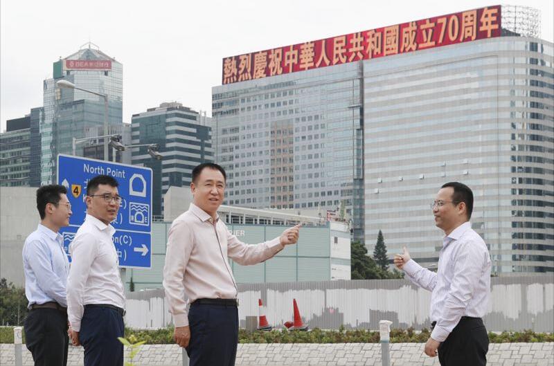 许家印检查恒大香港总部大楼国庆标语的展示效果