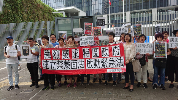另外,昨日有30名市民到政府總部外請願,要求特區政府盡快立《反蒙面法》。他們在請願信中表示,支持警察嚴正執法,速拿亂港分子及暴徒。信中明言要守護香港法制,嚴懲破壞法制的暴徒。他們強烈要求特區政府速立《反蒙面法》,並啟動《緊急法》:「不蒙面,不縱火,不堵路﹗三大訴求,缺一不可﹗」