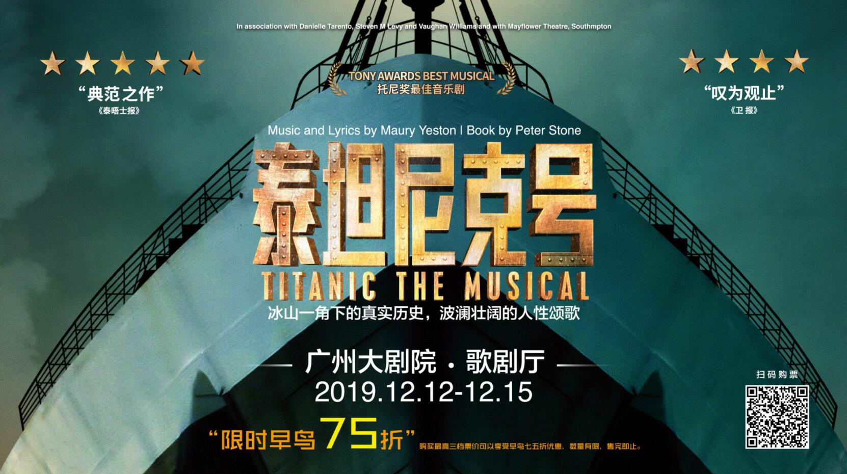 22年前,电影《泰坦尼克号》中杰克与露丝的爱情打动了无数观众,其实英文原版音乐剧《泰坦尼克号》更早于电影问世,捕捉了电影未曾描绘的历史剪影,真实还原了107年前的史诗级海难,斩获了包括51届托尼奖最佳音乐剧奖在内的众多奖项。其世界巡演的版图跨越了美洲、欧洲和亚洲,将于2019年12月12日-15日登陆广州大剧院的舞台。演出于9月22日正式开票,购买前三档票价的观众还可享受早鸟七五折优惠。