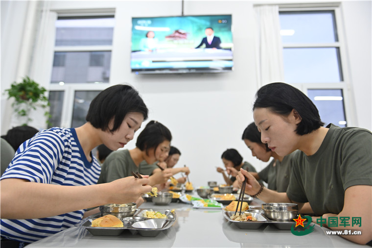 女兵換下濕透的衣服陸續到食堂吃午飯。炊事班科學制訂營養食譜,粗細混合、幹稀互補、葷素搭配,菜品一周不重樣。
