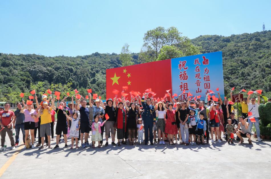喜迎國慶,觀音山景區內一派喜慶祥和,燈桿上、沿途休閑棧道上,隨處可見紅旗飄飄,節日氛圍濃厚。“我和我的祖國,一刻也不能分割,無論我走到哪里,都流出一首贊歌……”熟悉的旋律在景區內響起,大國旗逐步展開,周邊的游客迅速的聚集過來,圍繞在大國旗周圍。其中有懷抱中的孩童、老年夫婦、年輕情侶,還有外籍游客和志愿者們,手持著小國旗,為中國點贊祝福,并與大國旗合影,傳遞著游客們對新生活的熱愛,對美好生活的珍惜。