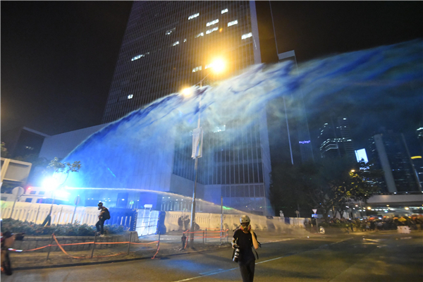 【香港商報网訊】記者戴合聲報道:昨日是違法「佔領中環」5周年,反對派組織「民陣」在添馬公園發起所謂「周年集會」,雖然提早結束,但仍有激進示威者在金鐘政府總部一帶進行小規模的堵路、掟汽油彈等暴力行為。警方晚上果斷執法,以水炮車多次向示威者噴射水柱及顏色水劑,並發射催淚彈。之後,列陣向灣仔方向推進,估計激進示威者「有心留力」,沒有進一步激烈行為就四散。至昨晚9時,絕大部分示威者已散去。警方完全控制場面,市面回復正常。
