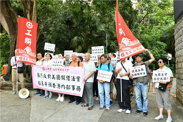 工聯會社會事務委員會昨日下午到花園道美總領事館外請願。代表們在館外拉起「強烈反對美國假借法案粗暴干預香港內部事務」字句橫額,並手持「強烈反對美國干涉中國內政」、「抗議美國踐踏國際法」等標語牌表達不滿。