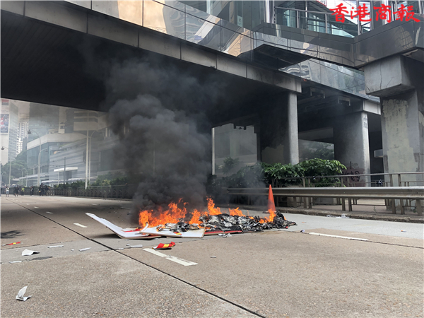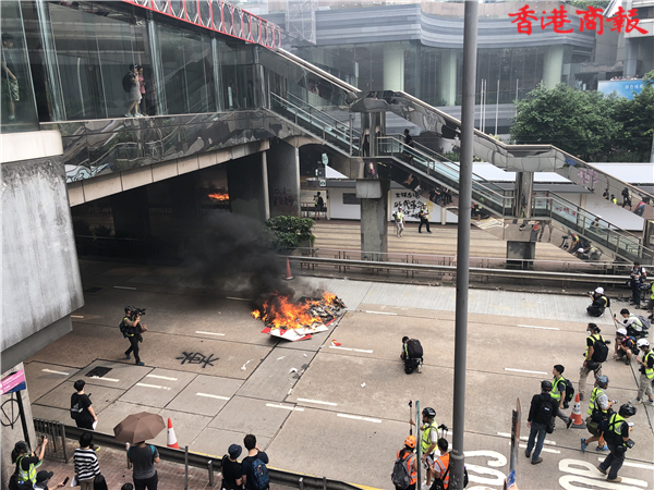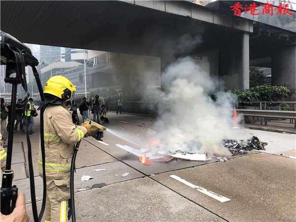 示威者在金鐘道天橋外縱火,其他消防到場撲滅。记者冯炜强摄