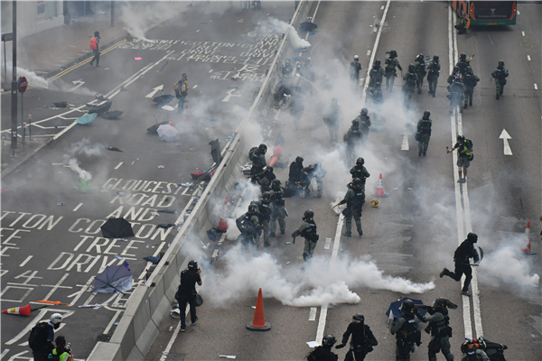 警方在水炮車支援下,沿灣仔軒尼詩道驅散示威者。水炮車由菲林明道開始推進,沿途發射水柱撲熄燃燒的路障和火種,亦一度發射藍色水劑,期間,暴徒不時向警方投擲雜物及汽油彈,警方施放催淚彈和發射防暴槍,速龍小隊亦在場協助驅散。