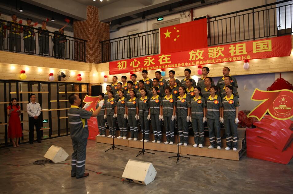 【香港商報訊】記者黃裕勇報道:2019年9月29日,海珠區城管和執法局在海珠區環衛工人之家,舉辦以“初心永在、放歌祖國”為主題的慶祝新中國成立70周年歌詠比賽活動。一線環衛工作者們以最質樸的聲音表達對祖國的情,以最真摯的感情唱響對祖國的愛,一首首耳熟能詳的紅歌為祖國送上衷心的祝福。