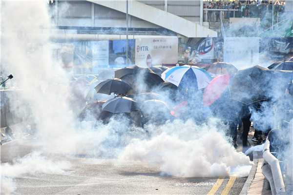 暴徒一度想衝上天桥攻擊警察,被多發催淚彈驱散。记者 冯瀚文 摄