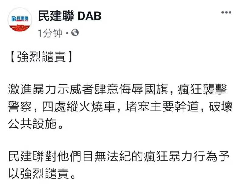 民建聯對他們目無法紀的瘋狂暴力行為予以強烈譴責。