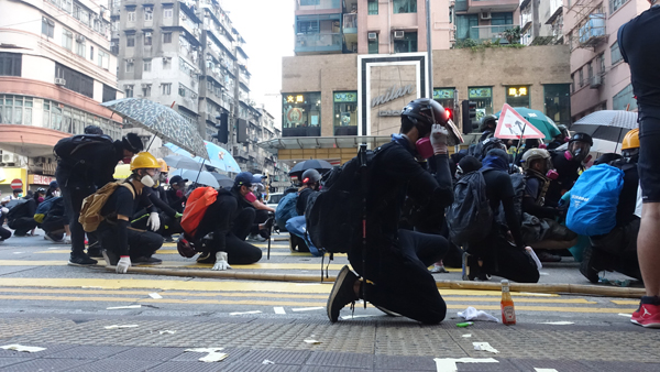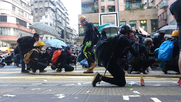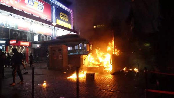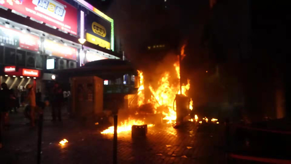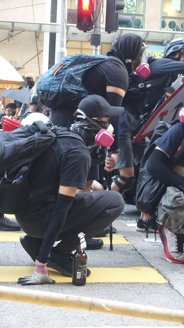 他們和警察多度對峙,不停扔出汽油彈,現埸不時燃起熊熊大火, 其中香港電台的記者被飛出來的碎片傷到了右邊的眼角, 小記現場幫他清洗傷口, 沒有大礙, 之後救護車到場把他送到醫院檢查。