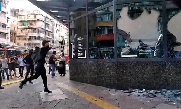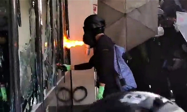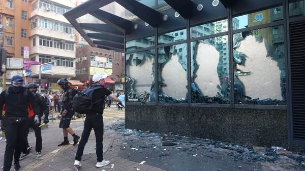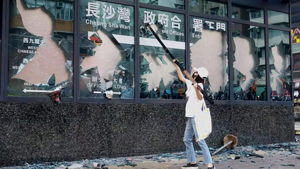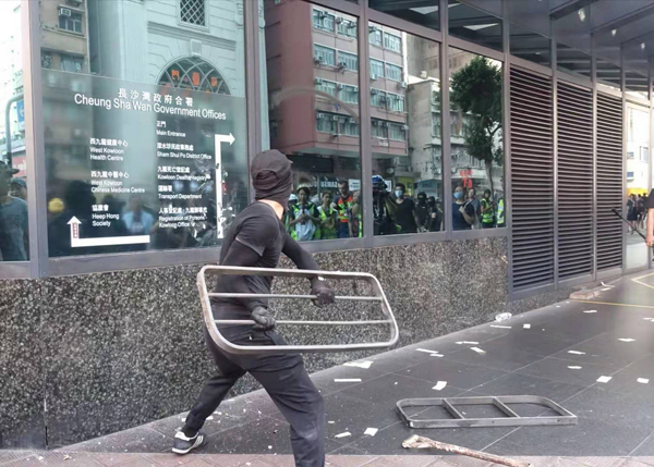 【香港商報網訊】記者木子報道:1日下午有大批示威者聚集在深水埗,大肆破壞長沙灣政府合署,用儘各種方法砸爛強化玻璃,並往裡扔汽油彈,很多女生也親自上陣,砸得比男生還兇。