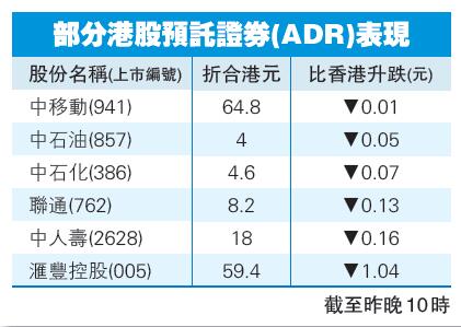騰訊控股(700)ADR報326.1元,較港收市跌4.13元;港交所(388)ADR收報227.3元,較港收市跌2.72元;滙豐控股(005)ADR收報59.4元,較港收市跌1.04元;友邦(1299)ADR收報72.9元,較港收市跌1.18元,但中移動(941)ADR則收市報64.8元,下跌0.01元。