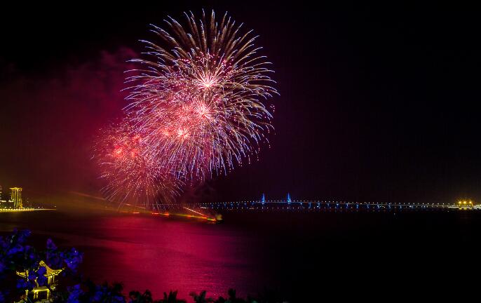 絢爛焰火照耀下的港珠澳大橋格外美麗。