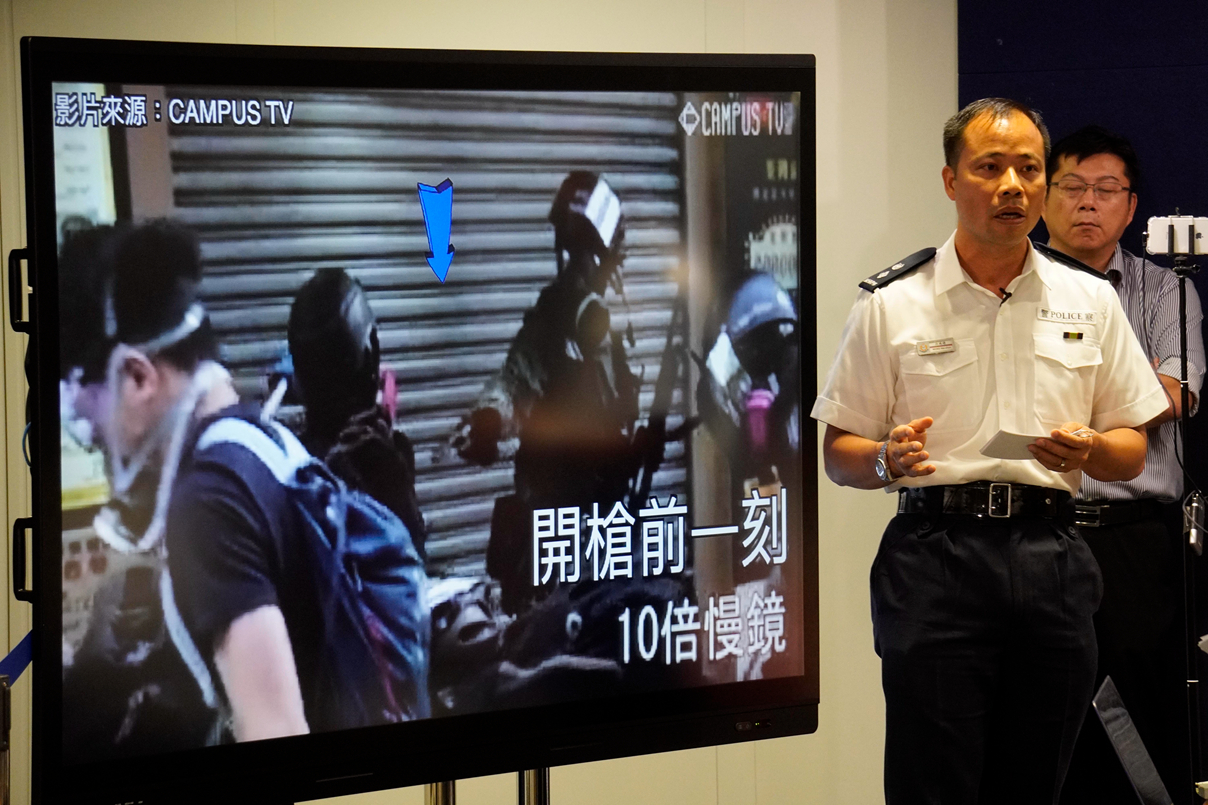 在記者會上,行動科高級警司汪威遜透過開槍現場拍得多段片段及圖片,就開槍事件作出非常詳細解釋。他指出,當時警方在荃灣大河道執行職務,受到大批示威者襲擊,包括掟磚及以不同的致命武器追打,有拿着大型盾牌防暴警員在後退期間跌倒「離群」,即遭十多名暴徒按在地上以鐵錘、士巴拿、鐵通、尖物等攻擊頭部。趕到救援警員眼見有同袍生命受到威脅,即舉槍戒備。在處理過程中,該警員亦受到生命危險,所以決定向施襲暴徒開槍,在開槍後,並無以槍械處理其他人。