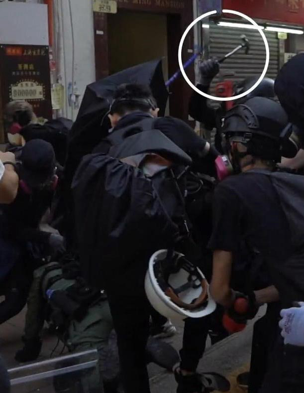 荃灣開槍案現場圖片顯示,多名暴徒持士巴拿(上圖)及鐵鎚(下圖)等,向倒地的警員瘋狂襲擊。網上截圖