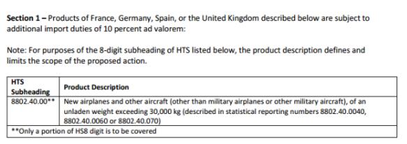 根据上述USTR征税清单可以看出,将面对10%关税产品的是“空载重量超过30,000千克新的飞机和其他飞机(军用飞机或其他军用飞机除外)。”其主要惩罚对象即为空客生产国——英、法、德、西四国。