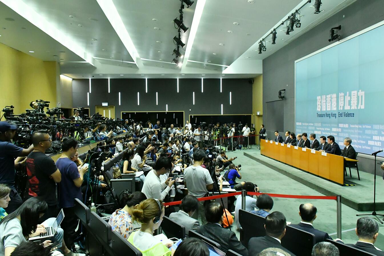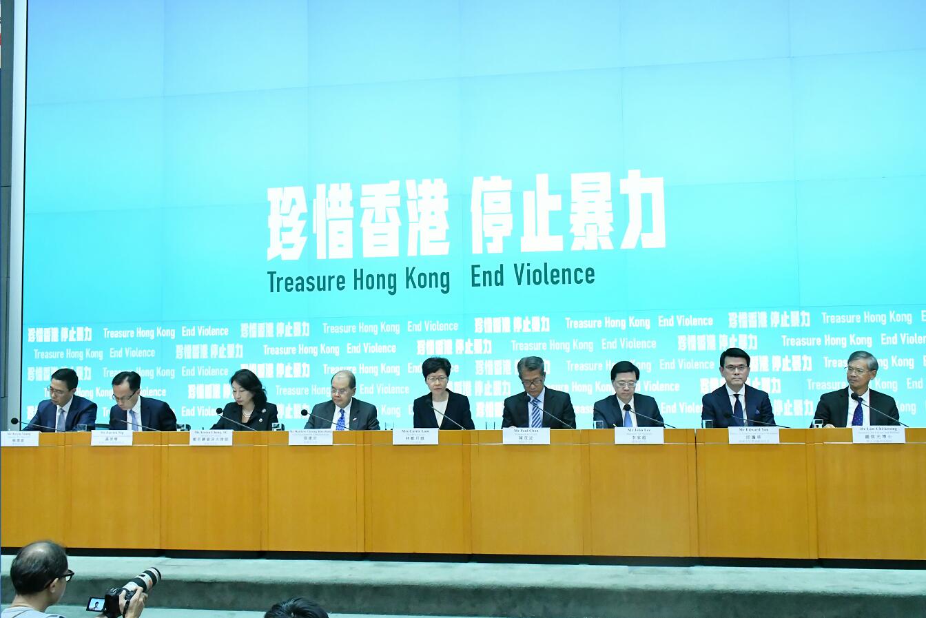 40名建制派立法会议员发表声明,支持特区政府采用有效止暴制乱的手段,协助警方执法,以便尽快恢复社会秩序。