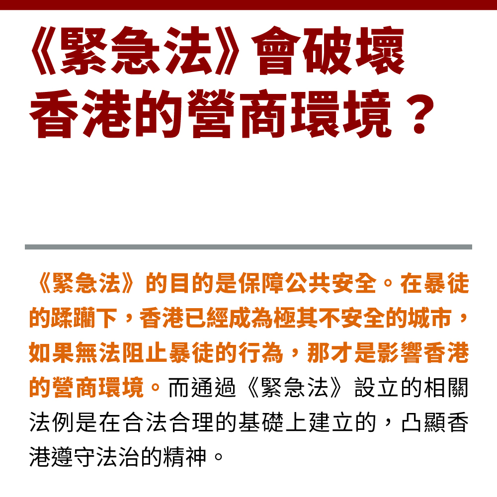 声明指,由于近期暴力示威者的暴力程度不断升级,危害公共安全,因此,对于特区政府宣布,立即引用《紧急情况规例条例》,通过《禁蒙面法》,禁止相关人士在指定场景而无合法理由遮闭全部或部分面容,表示支持。
