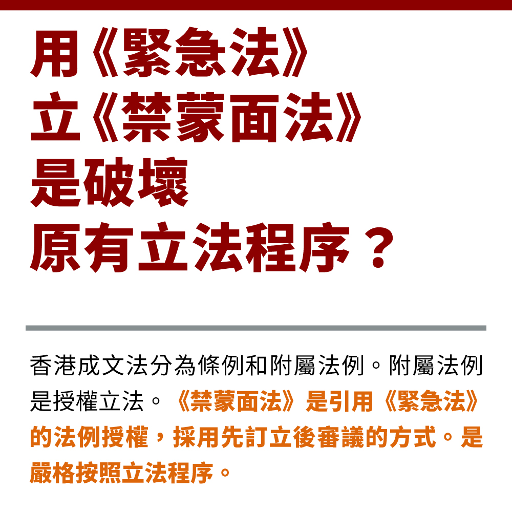 政府消息人士表示,10月1日國慶日社會出現的情況,已經可以列入可引用《緊急法》的混亂情況,但強調並不意味香港進入緊急狀態,雖然政府曾考慮執行問題,但認為現時社會有一定共識,《禁蒙面法》可以賦予警方更大權力,應付違法示威,亦不擔心會影響人身自由,因為如任由情況繼續惡化,反而保障不到市民的自由。一旦《禁蒙面法》通過後,可立即實行。