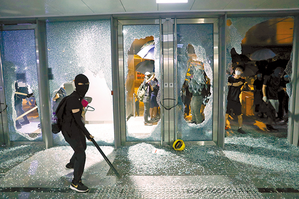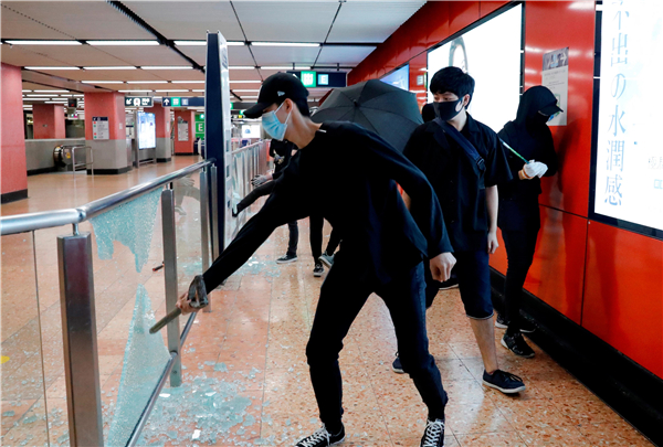 一群黑衣人在港鐵旺角站內大肆破壞。路透社