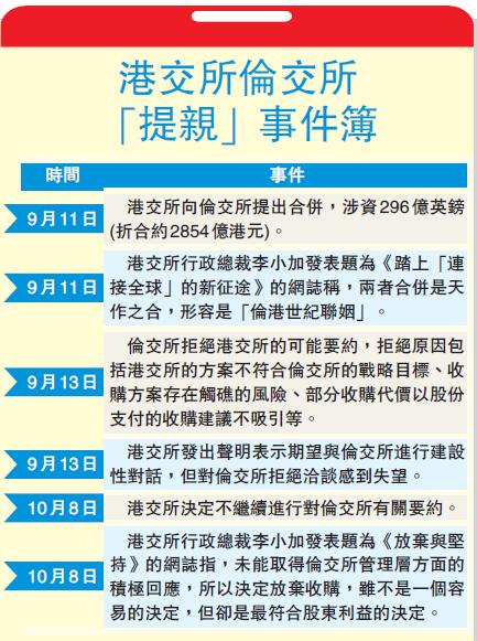 港交所上月中提出與倫交所的併購方案,總作價約296億英鎊(折合約2854億港元)。除了25%現金,其他以發行港交所股份支付。併購建議迅速遭到倫交所以香港政治動蕩及其他複雜因素為由拒絕。同時亦只有很少倫交所股東支持今次併購建議。據悉,倫交所十大股東中,僅一名股東支持港交所今次收購要約。