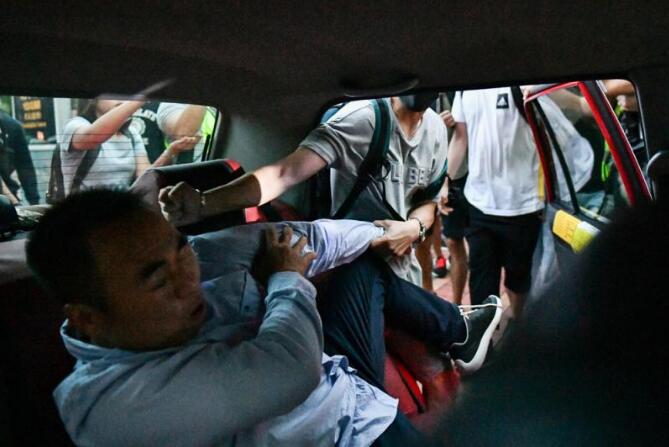 亂港暴徒10月7日在沙田商場毆打與他們意見不同的市民,這名男子坐進的士內仍被拉開車門繼續追打。(网络图片)