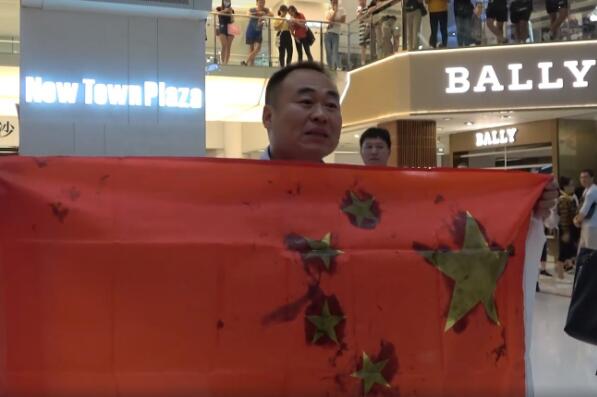 有市民於沙田新城市廣場保護國旗而遭市民「私了」。 視頻截圖
