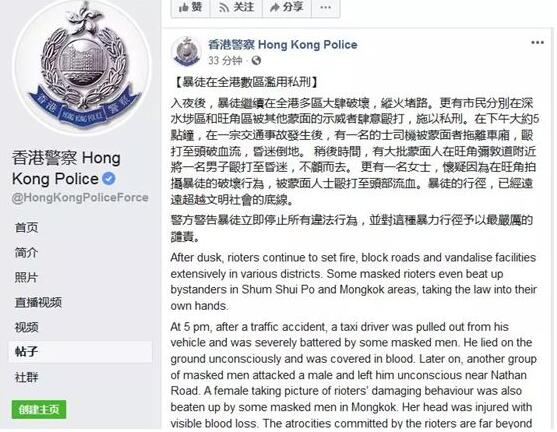当天晚上7时33分,香港警方在脸书发表声明,谴责警告暴徒立即停止所有违法行为,并对暴力行径予以最严厉的谴责。警方在声明中也提及马蹄露被暴徒袭击一事,称「一名女士,怀疑因为在旺角拍摄暴徒的破坏行为,被蒙面人士殴打至头部流血」,并表示「暴徒的行径,已经远远超越文明社会的底线」。