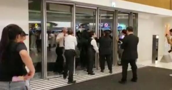 多名新港城中心職員頂住玻璃門,阻止警員入內。