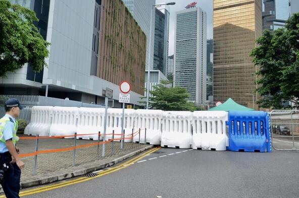 立法會明日亦會召開內會和財委會會議,今早所見警方已擴大政府總部及立法會大樓的封鎖範圍,架設大型水馬,示威區對出的立法會道亦被封鎖。