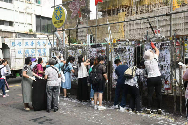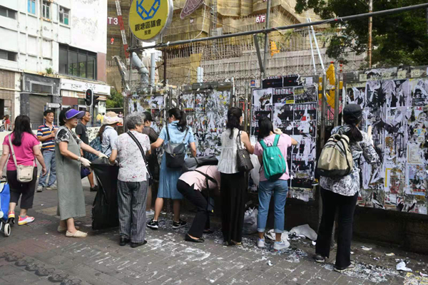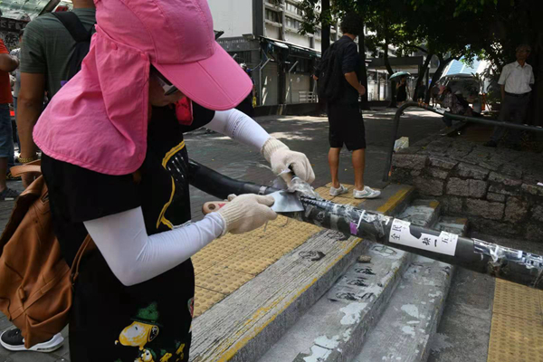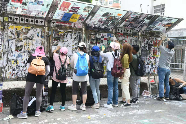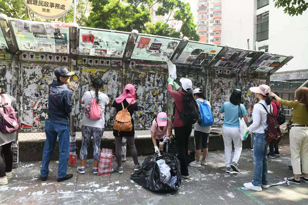 【香港商報网訊】记者林骏强、蔡启文、罗璇报道摄影:自6月以來,亂港暴徒在全港多處街頭設立所謂「連儂牆」,尤其是每次暴亂過後,街道、牆壁等均會留下大量垃圾及標語,不僅為社區的環境衛生帶來隱憂,更頻繁引發市民爭端。