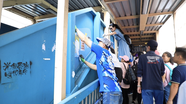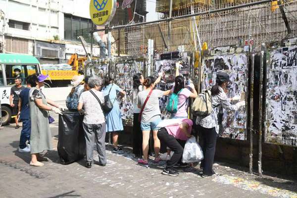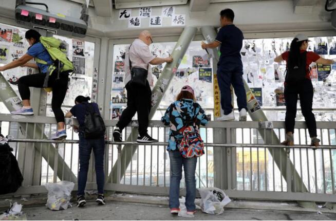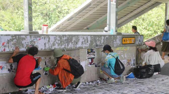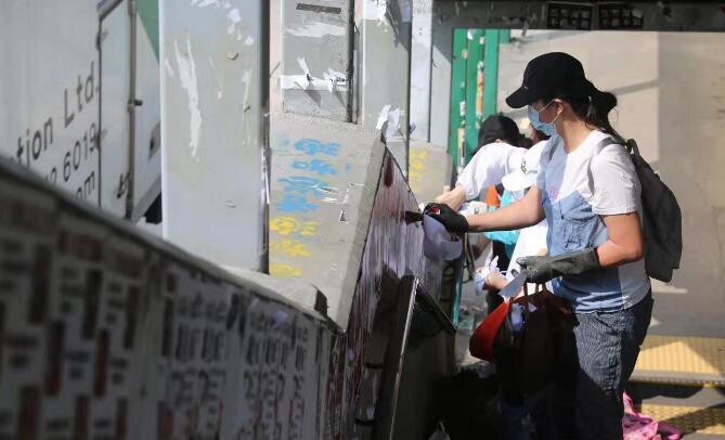 圖:市民自發聚集在連接九龍灣港鐵站的人行天橋上,清理貼滿宣傳海報的所謂「連儂牆」。大公文匯全媒體