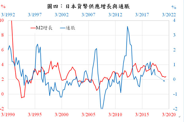 最後看廣義貨幣供應。圖四顯示,日本M2增長除了在上調銷售稅時期(1997及2014年)及金融海嘯(2008年)外,整體走勢與通脹同向,前者領先後者兩年。日本M2增長自2016年開始回落,目前重返近八年低位,按藍箭預示,估計日本通脹在未來兩年回落,重返零增長機會偏高。