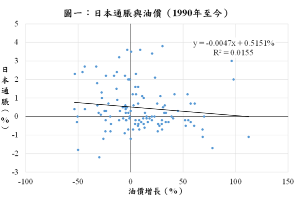 先看外圍。市場普遍參考油價增長來推測通脹,那麼套上日本數據會有啟示麼?有趣的是,圖一顯示油價增長與日本通脹近乎無關。其實日本整體及核心通脹的差距多年來偏小,可見其整體通脹不太受能源價格影響。轉看當地因素似乎比較合理。