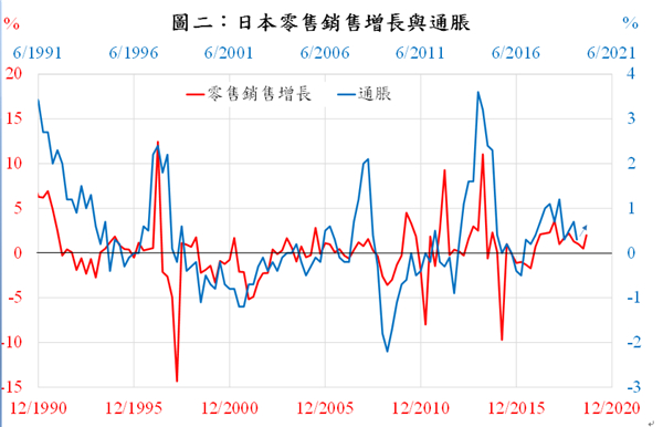 參考日本消費,圖二顯示零售銷售按年增長與通脹呈明顯正比關係,前者領先後者半年。日本零售銷售增長在2016年重拾升勢,到目前為止仍未重返萎縮水平,而過往兩季更小幅回升,按藍箭預示,估計日本通脹在未來半年略見上升。