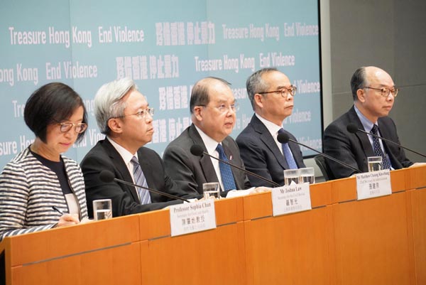 張建宗續指,破壞容易、重建困難,市民也會對暴力感到恐懼,要盡快停止所有暴力行為,與暴力劃清界線。他強調,香港實在無法承受長時間的破壞,政府未來會「三條腿走路」,包括止暴制亂、繼續與市民對話以及處理社會的深層次問題,令香港走出困局。