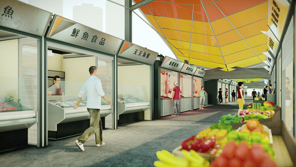 天水圍臨時街市攤檔模擬圖,集中售賣肉魚蔬果等新鮮食材。