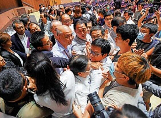 【香港商报網訊】為聽取學生及校友意見,香港中文大学校長段崇智10日在校園內的邵逸夫堂舉行對話會。但大批涉暴學生卻視之為批鬥大會,多次打斷其發言,更以鐳射筆照射其臉部,現場還多次有人高叫「段狗可恥」、「×你老×」等惡言辱罵挑釁。