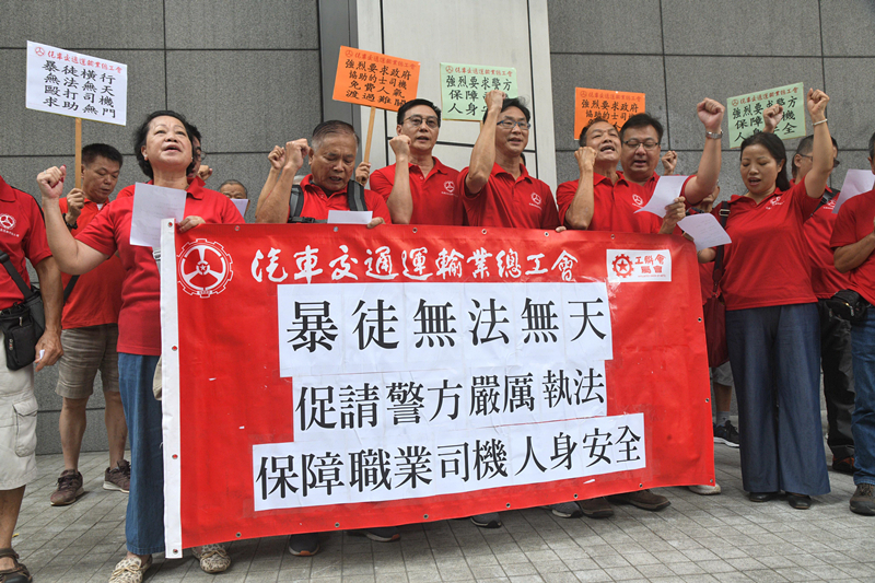 汽車交通運輸業總工會約20位成員,昨日早上到警察總部請願,促請警方對暴力示威嚴厲執法,同時應保障職業司機的人身安全。該會主席陳兆華指出,近期暴力示威不斷升級,本月6日,長沙灣出現有的士司機被拉出車廂、被毒打至重傷的事件,顯示濫用私刑情況日趨嚴重,對此極度關注,並予以強烈譴責。他又透露,該的士司機送往醫院急救後,目前已渡過危險期,形容他能存活「是非常幸運」。他慨嘆該司機的家人亦被網民「起底」,甚至遭到死亡威脅。