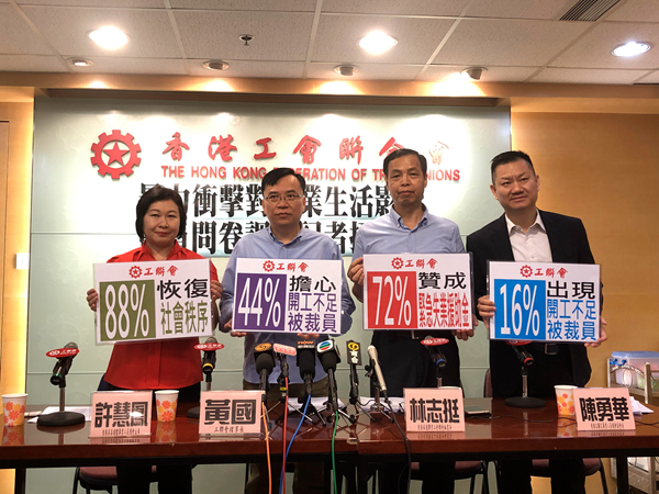 工聯會在9月尾以電話訪問1197名該會屬會會員。調查發現,暴力衝擊直接打擊香港經濟及港人就業。41%受訪者任職公司生意額出現下跌,當中11%更大幅下跌超過三成;13%受訪者任職公司出現裁員、減薪或放無薪假;16%受訪者本身更出現開工不足、收入下降,甚至被裁員。