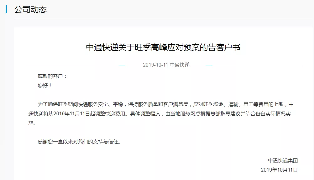 中通快递在《告客户书》中称,为了确保旺季期间快递服务安全、平稳,保持服务质量和客户满意度,应对旺季场地、运输、用工等费用的上涨,将从2019年11月11日起调整快递费用。具体调整幅度,由当地服务网点根据总部指导建议并结合各自实际情况实施。