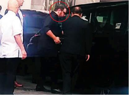 克魯茲(圓圈示)身穿黑衫,在金鐘一間酒店外步上黑色房車離開。