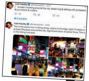 他又称自己在香港游走,会观察并与所谓的“示威者”、记者及市民交谈。他还上载一段暴徒遇上警察时落荒而逃的短片,以及一张We fight for democracy(我们争取民主)黑色涂鸦的照片,霍利的Twitter所谓直击,没有提到警察被暴徒?颈放血、抢警枪、放火、打砸商店,可见霍利的直击汇报,掩耳盗铃,公然造假。
